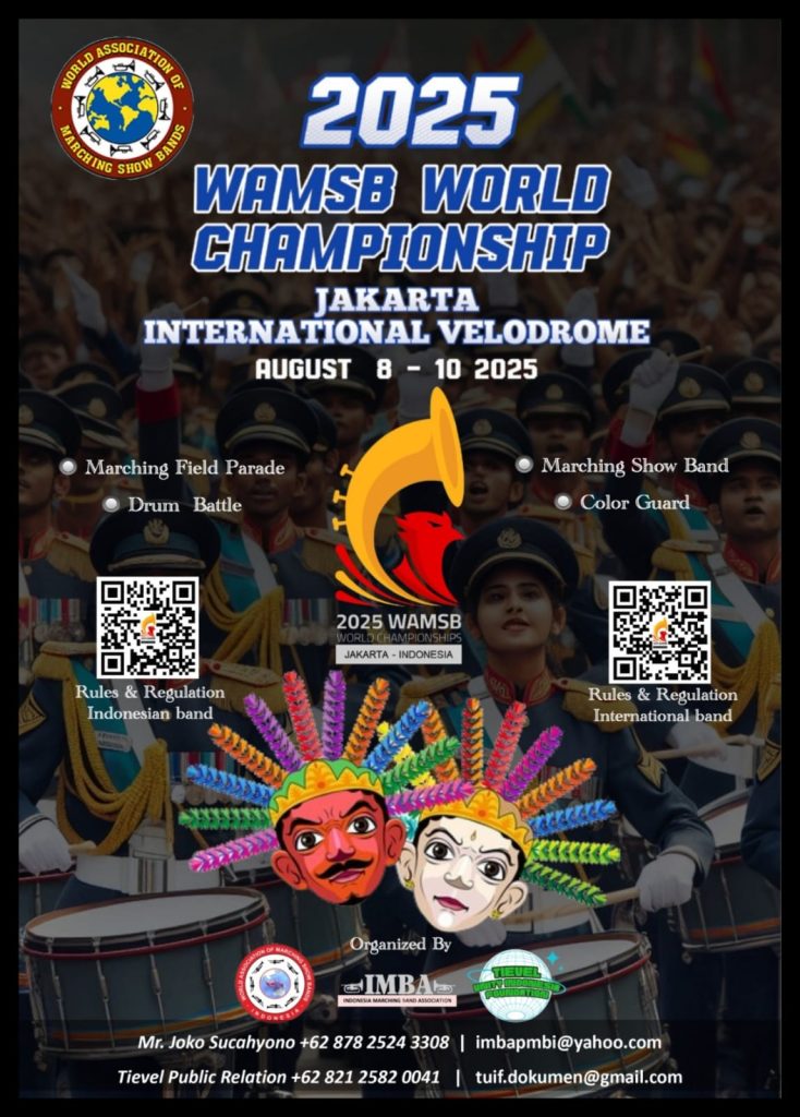 2025 WAMSB WORLD CHAMPIONSHIP KEJUARAAN DUNIA MARCHING BAND 2025 Click The Button below to Download The Invitation INVITATION Click The Button below to Download The Rules & Regulations RULES & REGULATIONS Click The Button below to Download The Registration Form / Registration Online REGISTRATION FORM Google Form Registration - English Google Form Registration - Indonesia Click The Button below to Download detailed Living Cost [UPDATED] Catering Services Bus Rental Services Hotel Services